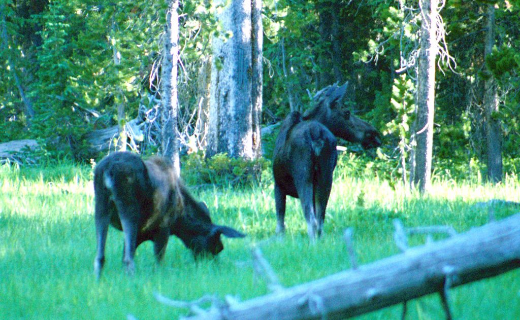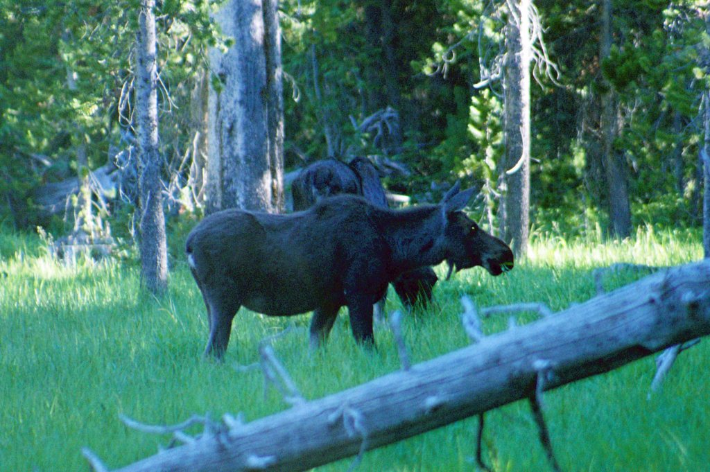 After a long day we were getting close to Old Faithful when we saw the wildlife indicators again – parked cars. We stopped to see what the attraction was this time and it was….A MOOSE! It was a cow and a calf in a swampy area, right where you would expect them to be. Chrissy’s 10-year quest to see a moose was over! I’m not sure who was happier, her for seeing the moose or me being happy for her. She was so excited she couldn’t take any pictures. All our pictures of that pair were shot by me.