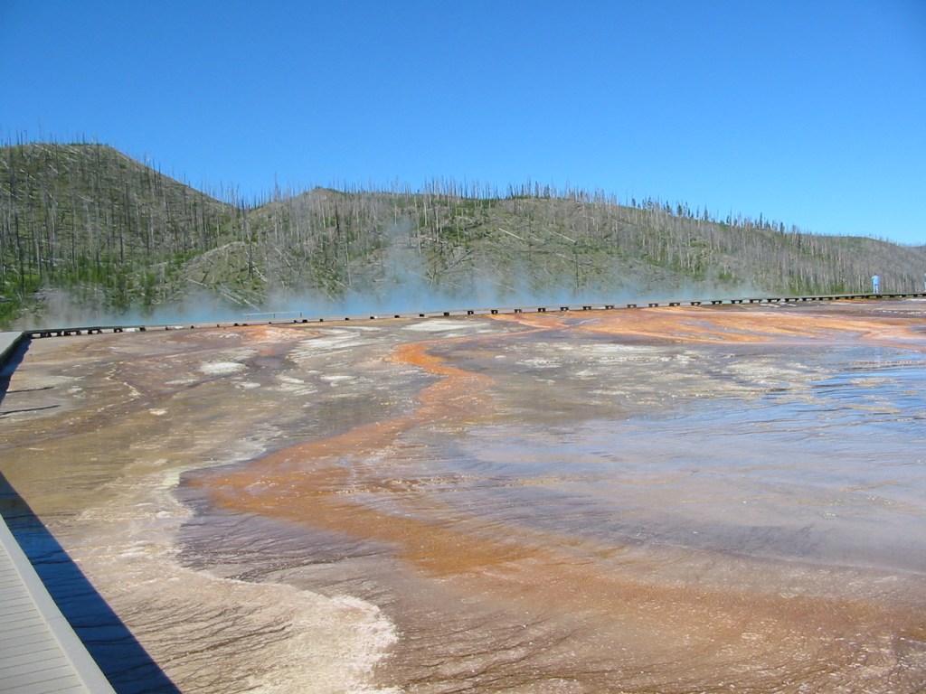 With full bellies, we set out driving north to go clockwise around the southern loop of the Yellowstone “figure 8”. Our first stop was the Midway Geyser Basin where we saw the Excelsior Geyser crater and the Grand Prismatic Spring as well as several other geysers, springs, and pools. The Grand Prismatic Spring was spectacular. From a distance the steam rising from the spring appeared blue as it reflected the colors from below. The blues and greens of the spring combined with the oranges and reds of the surrounding algae beds made for a truly awesome display of color.