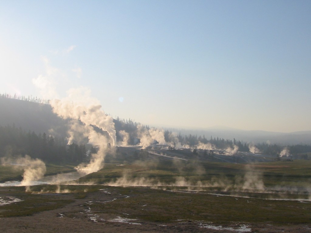 I woke up early this morning and went for a walk around the Geyser Basin by myself. I think it was around 6:30 when I went out and the temperature was in the upper 30’s or low 40’s. With the cool air there was much more steam than there was the evening before. I caught Castle Geyser erupting. It erupts for about an hour twice a day, a water phase eruption for about 20 minutes and a steam phase eruption for about 40 minutes. I missed the water phase but the steam phase was in full swing.