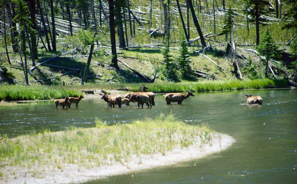 By now it was after 1:00 and we were hungry, so we drove to West Yellowstone for lunch. On the way we saw the tell-tale sign of wildlife in Yellowstone – a bunch of cars pulled over to the side of the road. It was a herd of elk – about 10-15 females and 8-10 calves either wading in the Madison River or grazing on the bank. We watched them for a while before heading on to West Yellowstone and lunch at a little café.