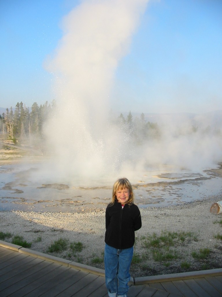It was an absolutely great morning. Just as we walked out of the Inn Old Faithful started erupting. We watched Old Faithful’s show, then walked up to Castle Geyser which was predicted to erupt in the next 20-30 minutes. Since it wasn’t erupting yet we walked past and saw some other geysers and springs. One geyser, officially called Sawmill Geyser, was erupting. Delaney renamed it “Rocket Geyser” and that’s what we called it for the rest of our stay.