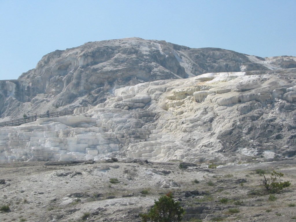 After looking at the buildings we went to the springs themselves. It was HOT that day and the kids did incredibly well. We were on boardwalks most of the way with a lot of stairs. It seems that at every turn in Yellowstone there is some new fascinating natural wonder to see. These springs with their mineral formations were just beautiful. The clear, pooling water and the mineral terraces sparkled in the sun. One particularly large terrace, called the Minerva Terrace, was very striking. We also saw the Liberty Cap – a mineral formation 30 feet tall caused by buildup from a spring over a long period of time.