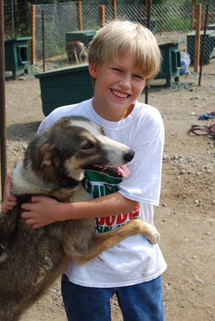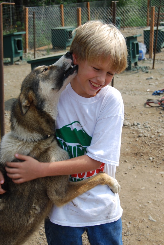 We broke camp (not much of an event in the RVs) and headed off in separate directions. Six of our party took one RV and went to a Musk Ox farm. Our family of four took the other RV and went to the Dream a Dream Dog Farm (Link Here). Aaron studied the Iditarod in school the year before and the class followed the race, so he was very excited to visit the farm. Plus we are dog-lovers anyway, so this was sure to be a great experience. And it was. We met the musher and owner of Dream a Dream, Vern Halter, and Aaron got his autograph. We saw a video about the Iditarod, checked out the equipment that they use, and (the best part) visited with the dogs and walked the puppies. Aaron picked out a dog (or did it pick him?) named Mocha that he spent a lot of time with. We were all dirty by the time we left, but especially Aaron after Mocha jumped all over him.