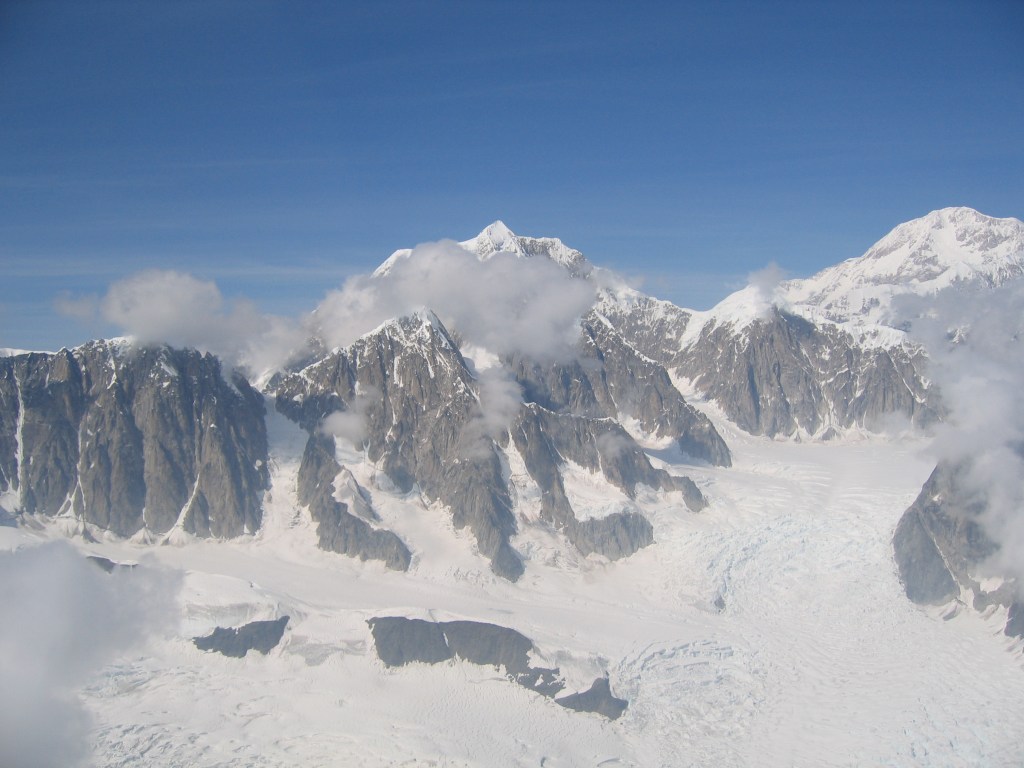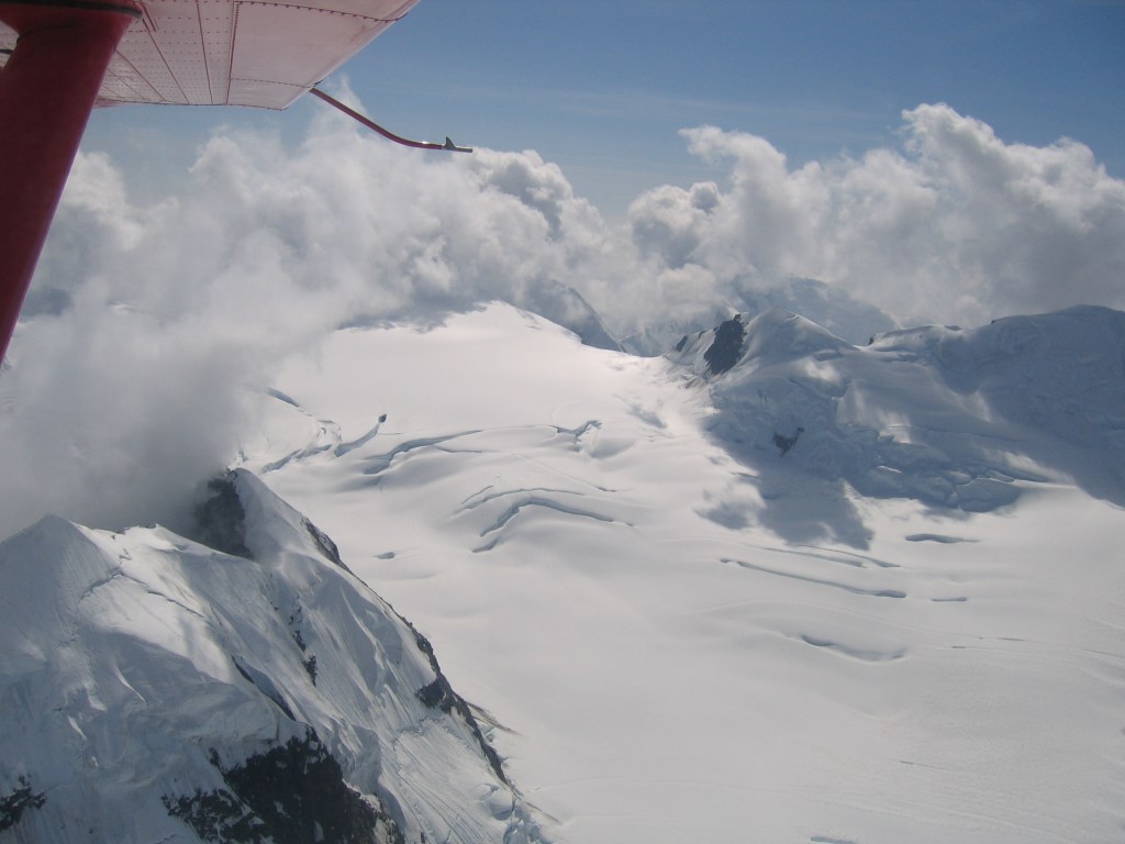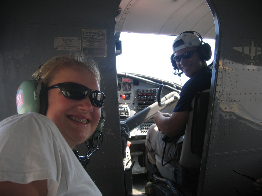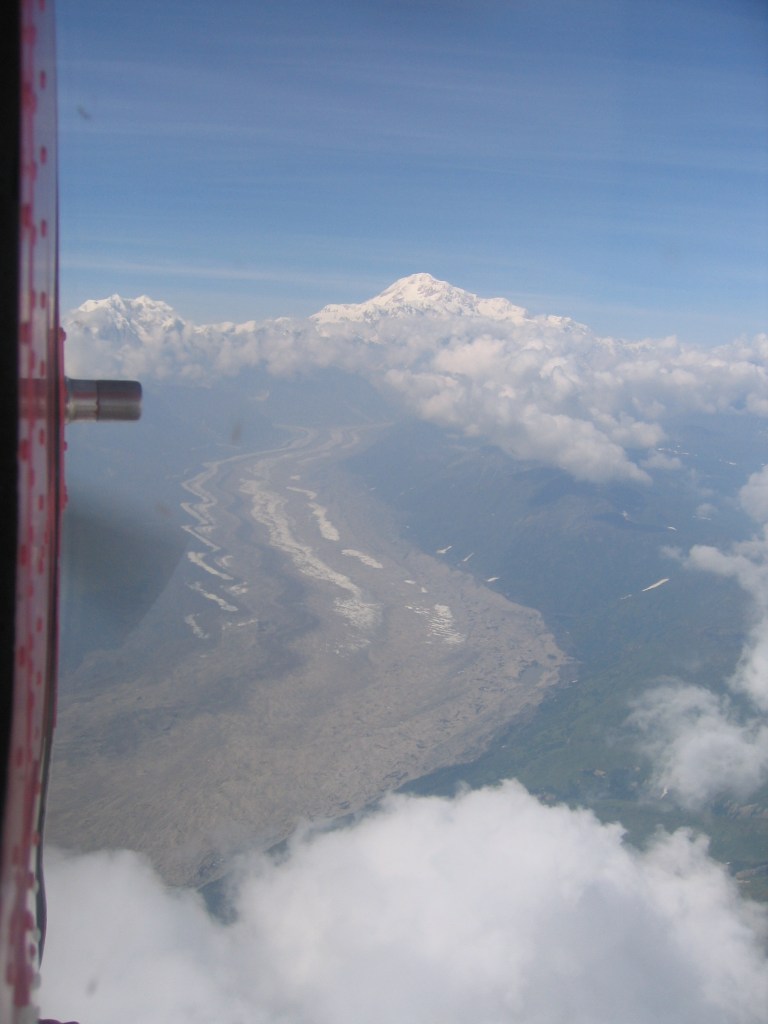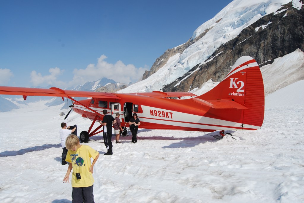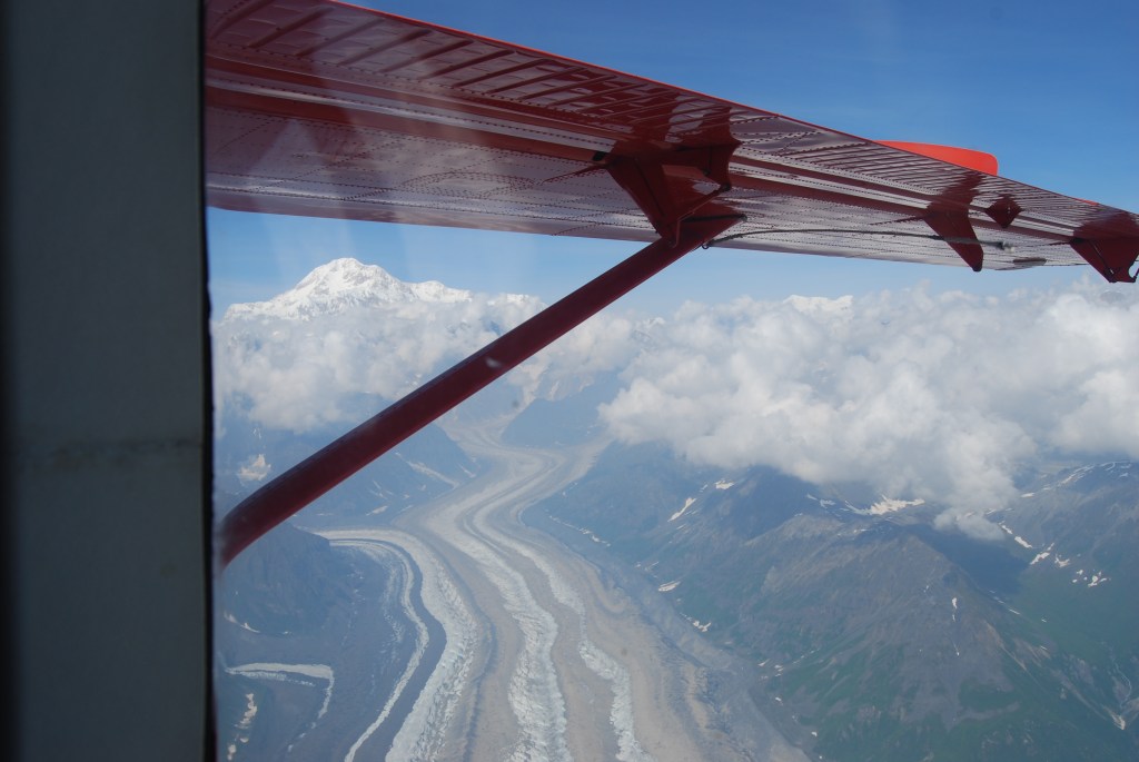 Our pilot was named Dale and he was a great pilot and tour guide and Andy got to ride in the copilot seat with him on the way out to the glacier. We landed on the Ruth Glacier at Mountain House. With the typically bumpy ride and constant smell of aviation fuel in a small plane, we all felt a little queasy when we landed on the glacier. However, only Aaron made a contribution to the glacier’s mass by puking on it. Pilot Dale reminded him that his puke would come out the bottom of the glacier in about 300 years. We didn’t spend long on the glacier, but long enough to take a good look around and take some great pictures. When we left we flew over Ruth Glacier all the way out of the valley – it was a beautiful ride back to Talkeetna.