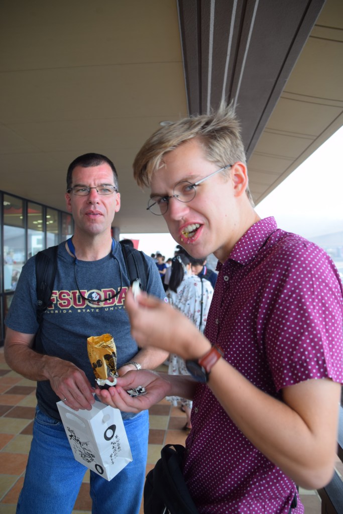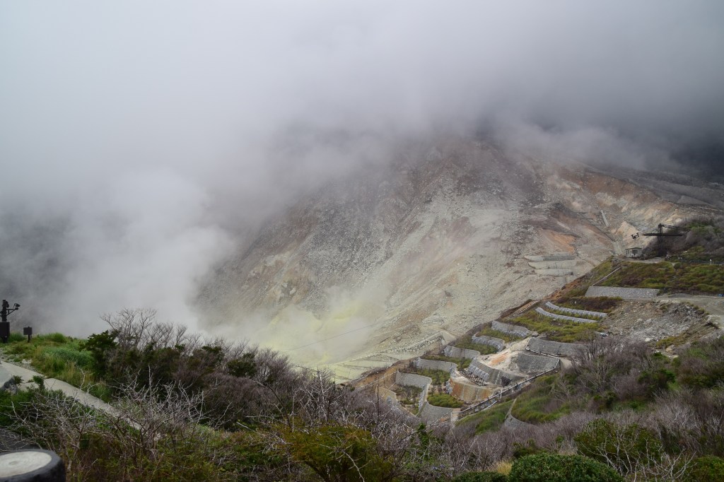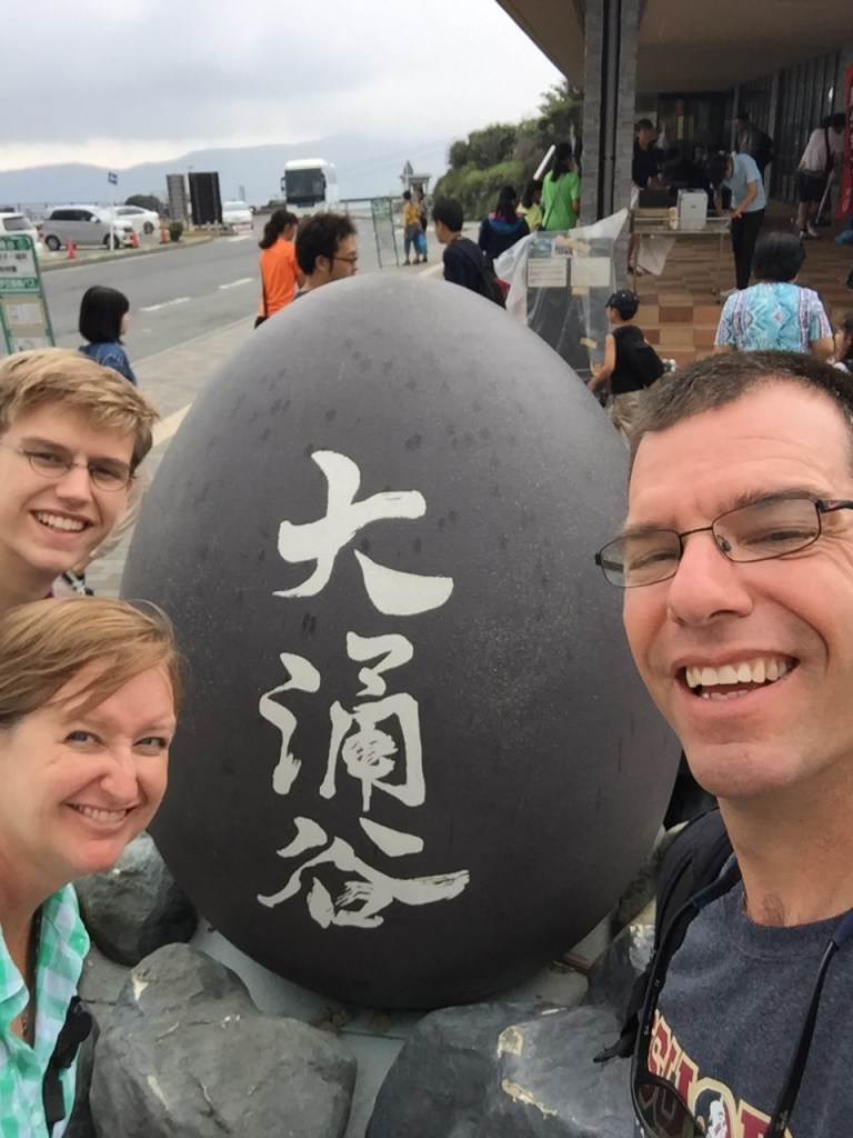 Once we checked in to the Ryokan, we took the Hakone Ropeway (elevated cable car, ski-lift style) to Owakudani. Owakudani is a very active thermal area. The tourist trap there is that they boil eggs in the volcanic water, which turns them black. The area where they cook the eggs was closed to visitors due to gas, but they were still selling the eggs so of course we each had to get one. The gas in the area was pretty bad. There was a little odor of my favorite molecule, hydrogen sulfide, but the bigger issue was sulfur dioxide – very biting, much like hydrochloric acid fumes. They did a good job of closing the areas at and downwind of the points where the gas was being released.