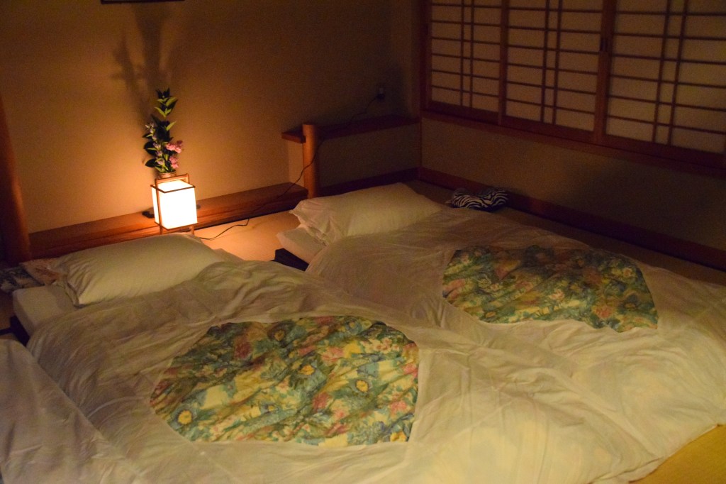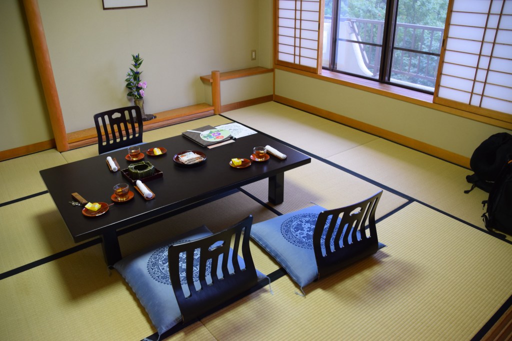 A Ryokan is a traditional Japanese lodging with baths, excellent service, and incredible food. Our room had a small sitting area with two regular chairs and a coffee table and a larger bamboo-floor room that has a low table during the day and becomes the bedroom at night. Breakfast and dinner are included in your stay at the Ryokan and they change the room while you are at the meal.