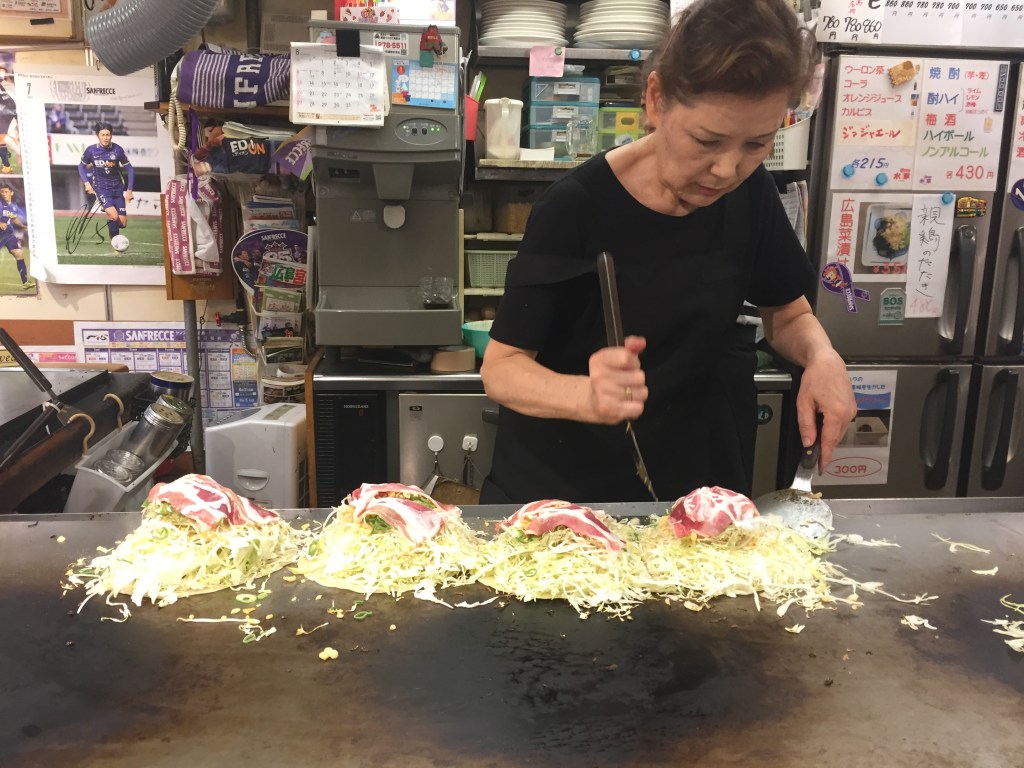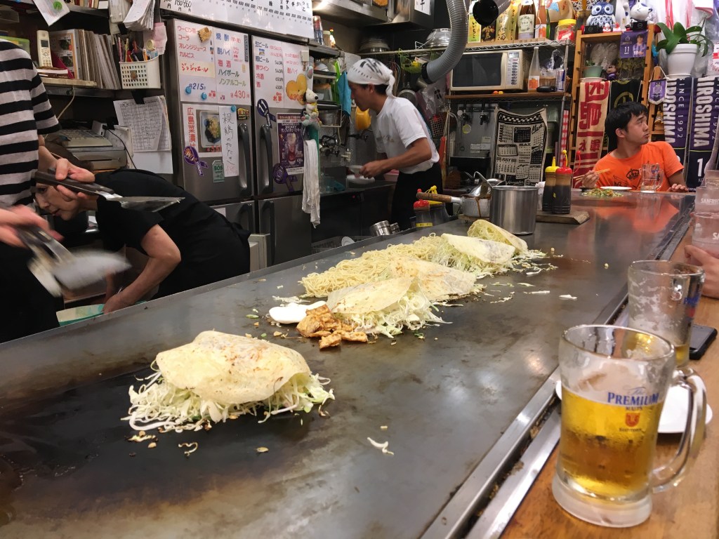 After spending the afternoon at the Peace Park, we checked into the Airbnb then set out to wander around the city. Aaron took us to dinner at Okonomimura. It is a multi-floor building full of stalls where they make Okonomiyaki, a noodle-cabbage-pancake dish that is excellent. You sit on a stool at the griddle, the chef makes the dish right in front of you, and you eat it directly off the griddle. It was a great experience, and absolutely delicious.
