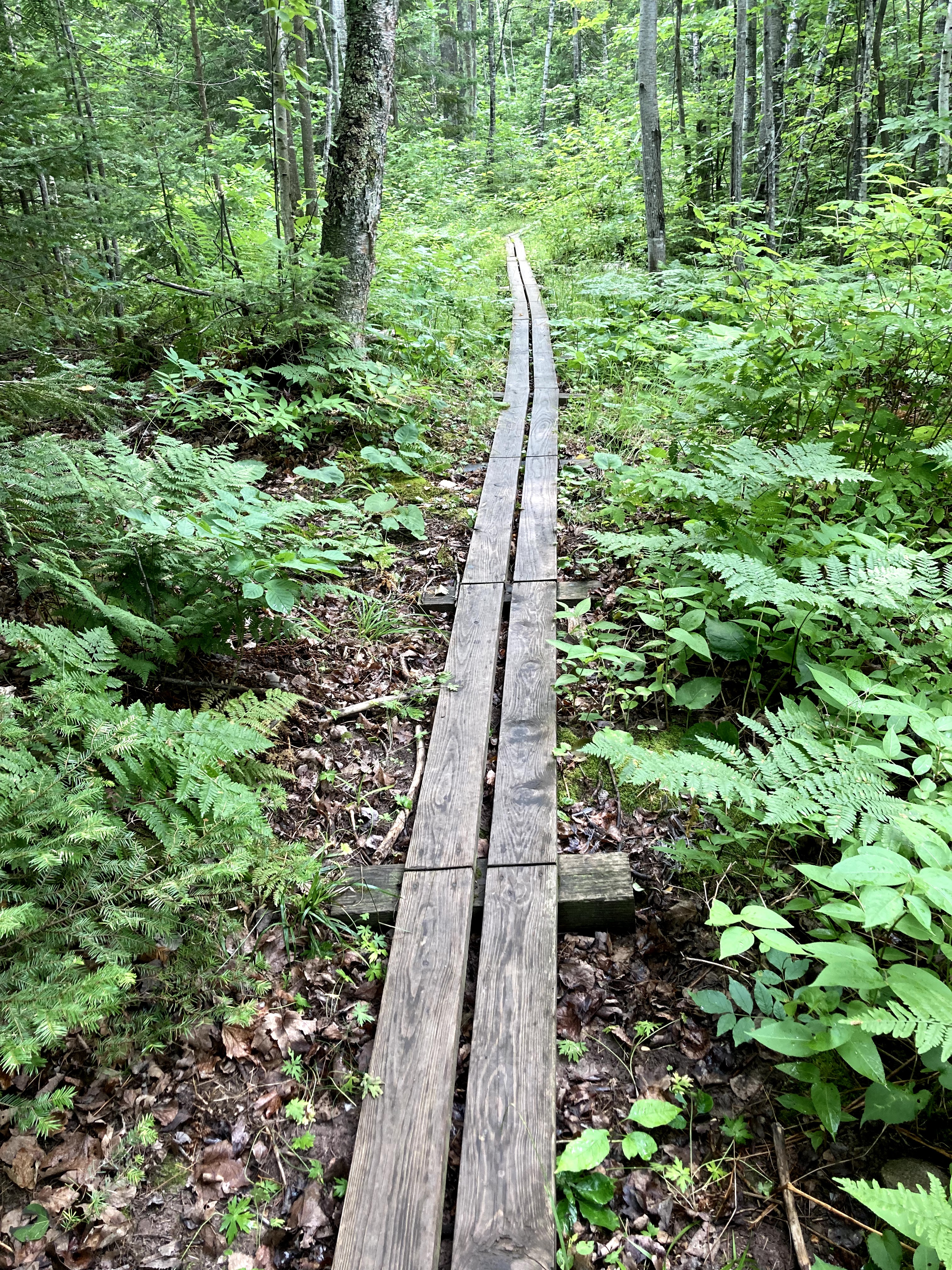 As we got lower on the ridge and closer to the lake, there were several places where the trail consisted of a bridge made of a couple of 2 X 6’s spanning across a swampy area. With a 40+ lb. pack on my back I was paying extra cautious attention to my footing in these areas. As we traversed one of these bridges I was in the lead and I suddenly heard a loud noise to my left front. I looked up to see a black bear running away into the woods. He (or she) ran from my 11 o’clock towards 7 o’clock and kept going deep into the woods, but because he ran that direction Chrissy got to see him too. We have seen bear in in our campground in North Georgia (ransacking garbage dumpsters) and from the car in the Carolina mountains, Yellowstone, Glacier, and a few other places. But this was our first encounter with a bear on a trail. It happened too quickly to get a picture. If I had only been looking out for him instead of watching my step perhaps I could have gotten a picture. Of course, I could also have slipped off the 2 X 6’s and broken an ankle, so I guess it wasn’t so bad.