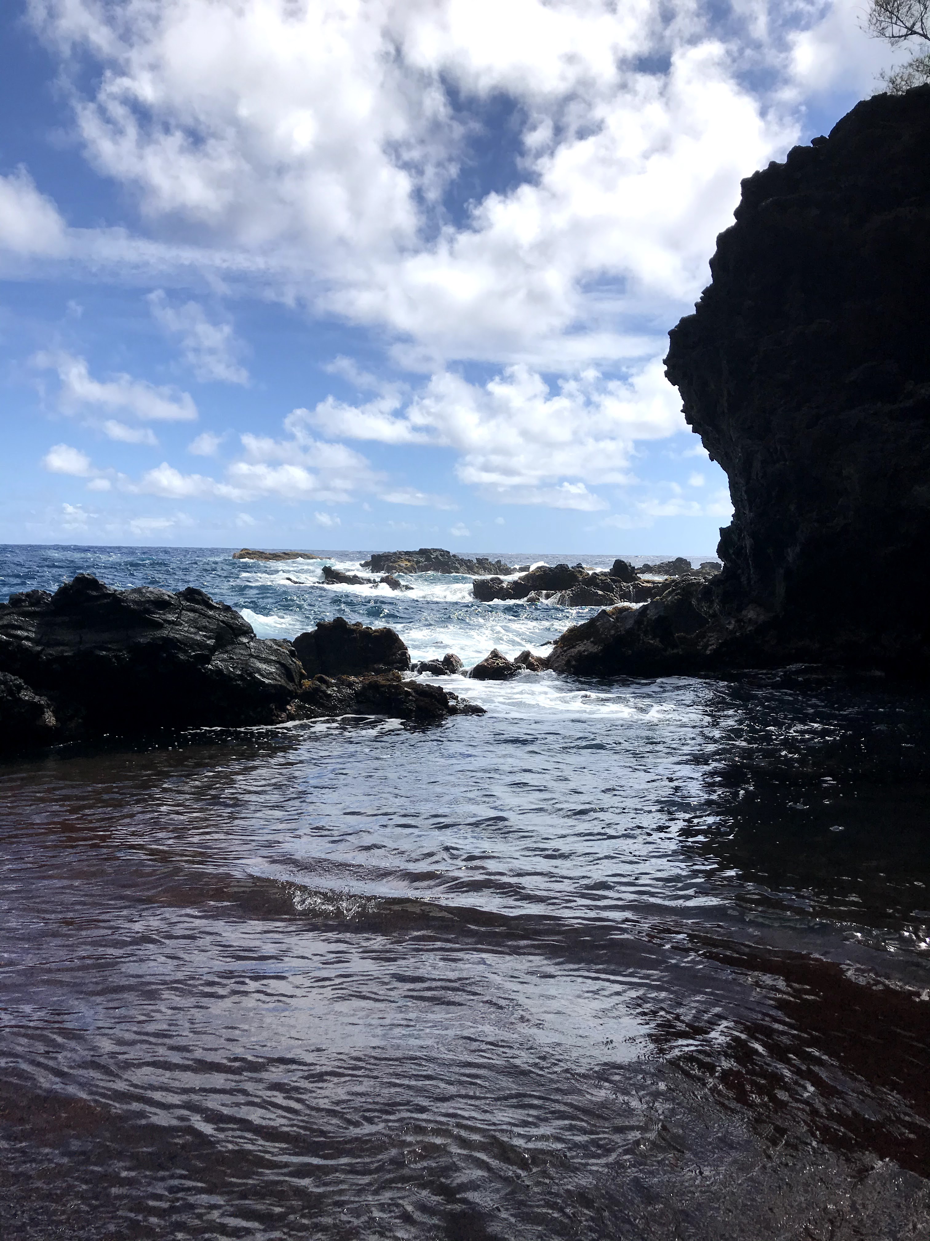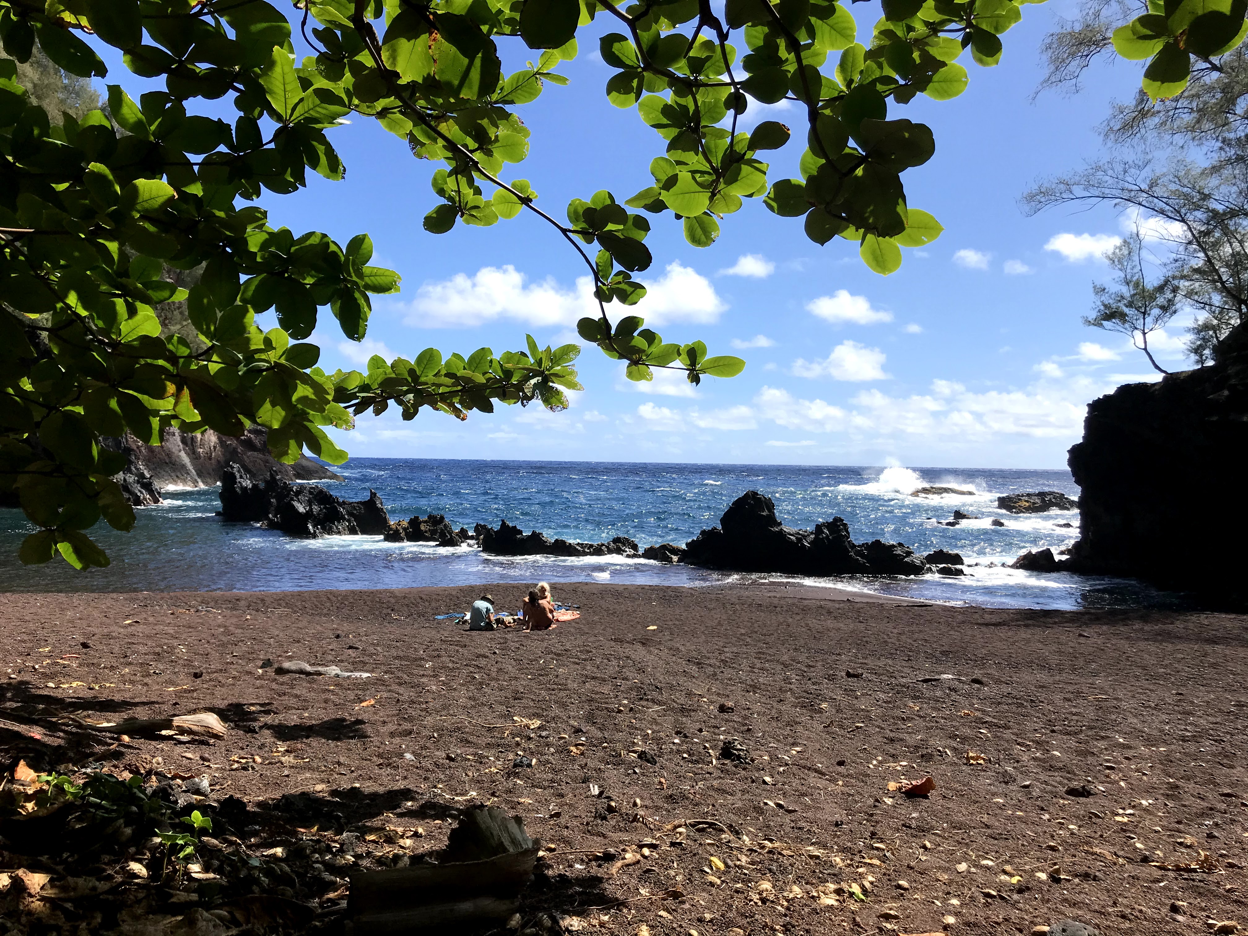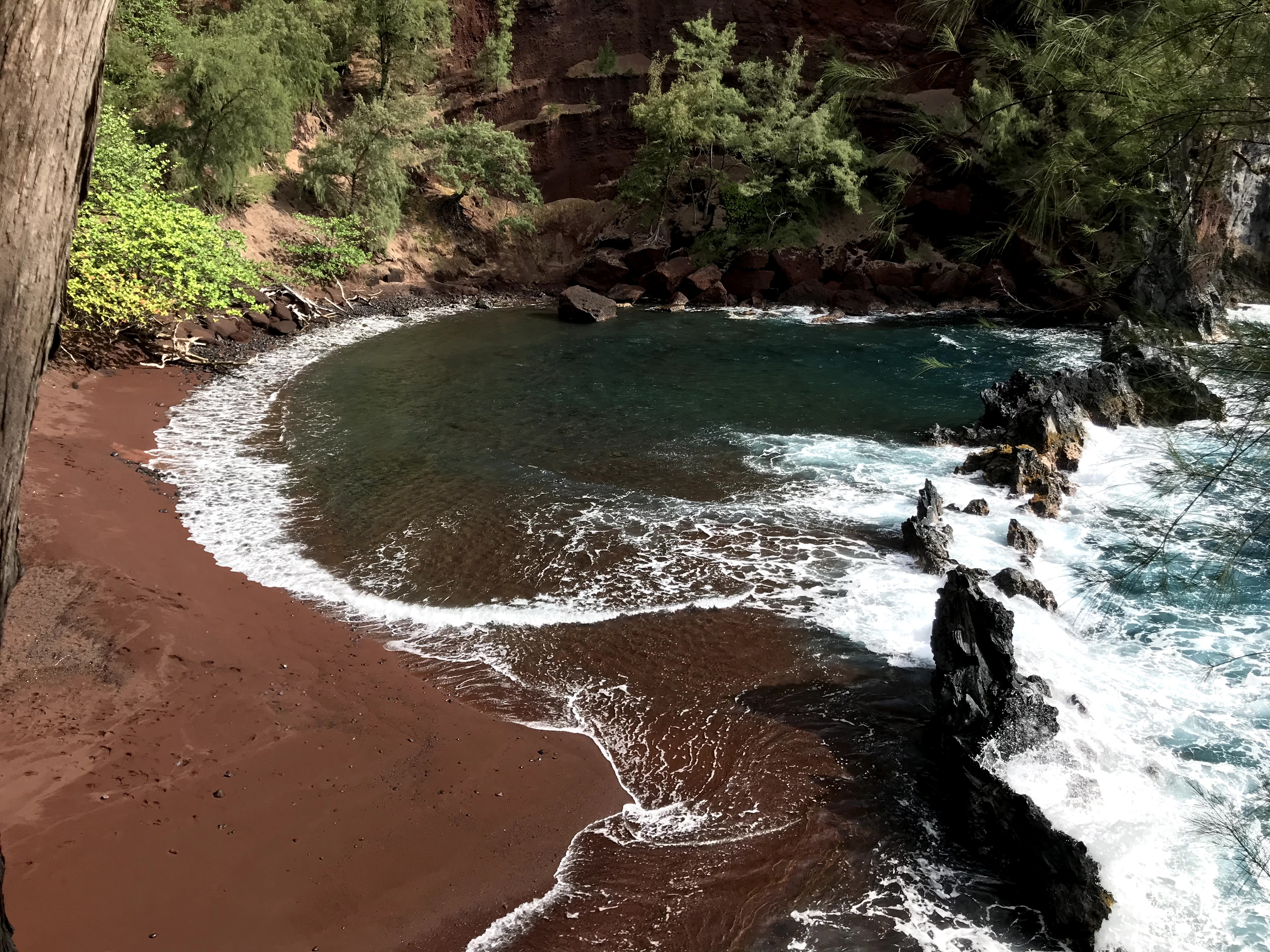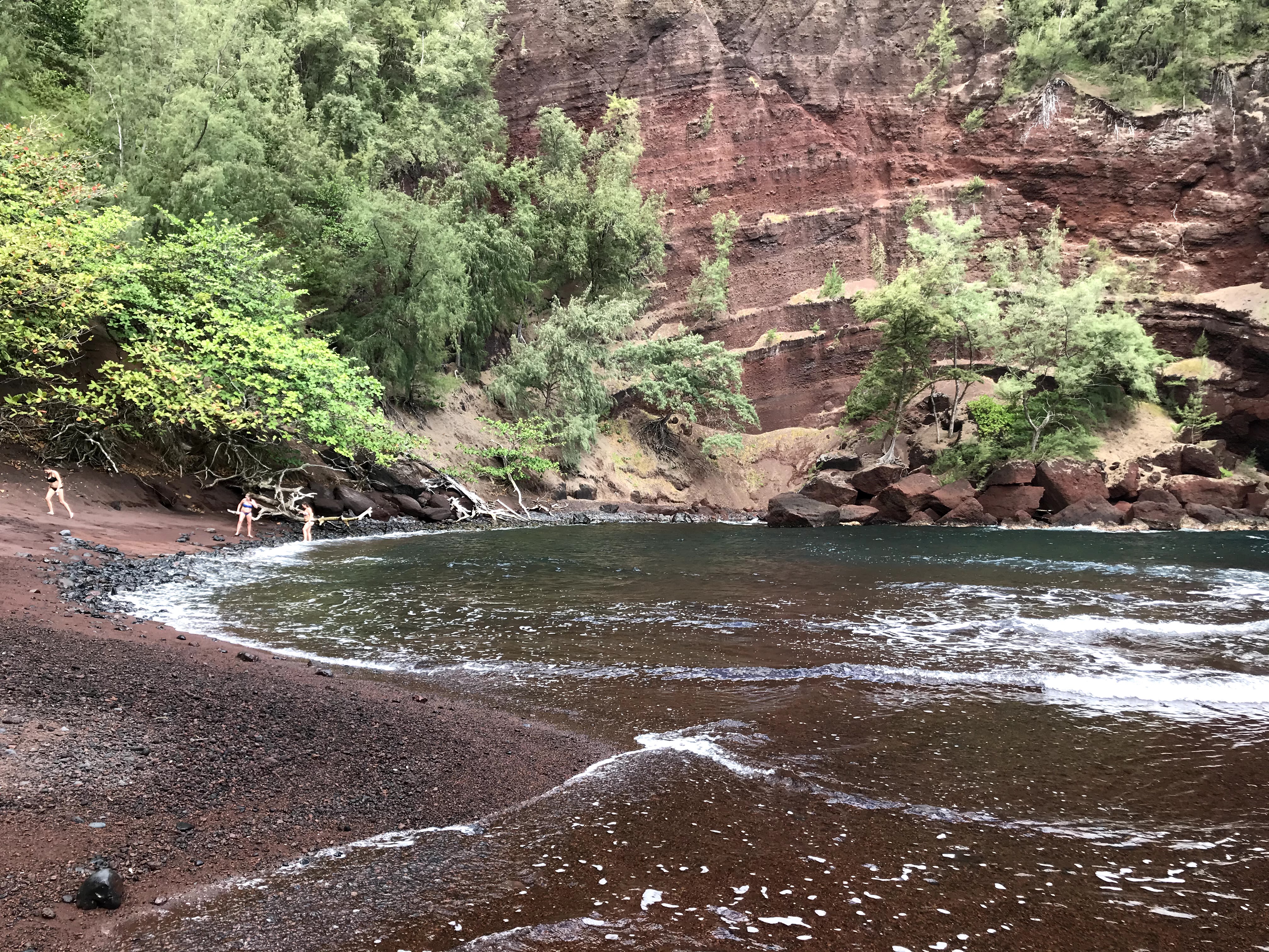 When I got back to the cottage Chrissy was up. We had some coffee, then set out to find the Red Sand Beach. It was early so we were able to park near the trailhead, which is behind the community center in Hana. We had to hike around a peninsula to get to the secluded cove beach. When we arrived we had the beach almost entirely to ourselves. The beach is clothing-optional and there was one guy stretched out in the sand taking advantage of his option. We both opted to keep our bathing suits on but were not bothered at all by him.