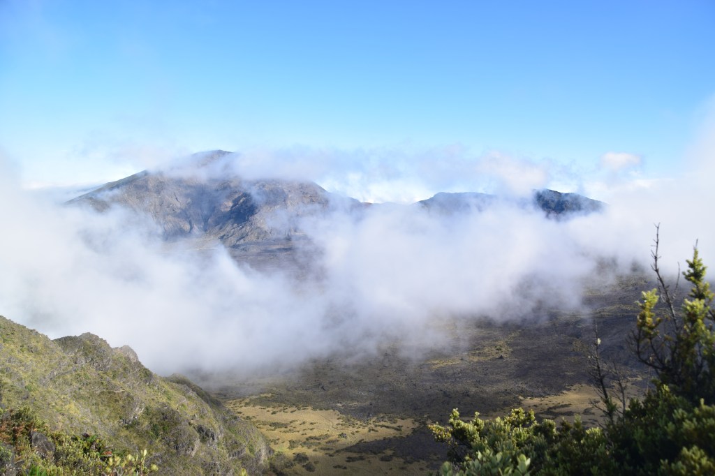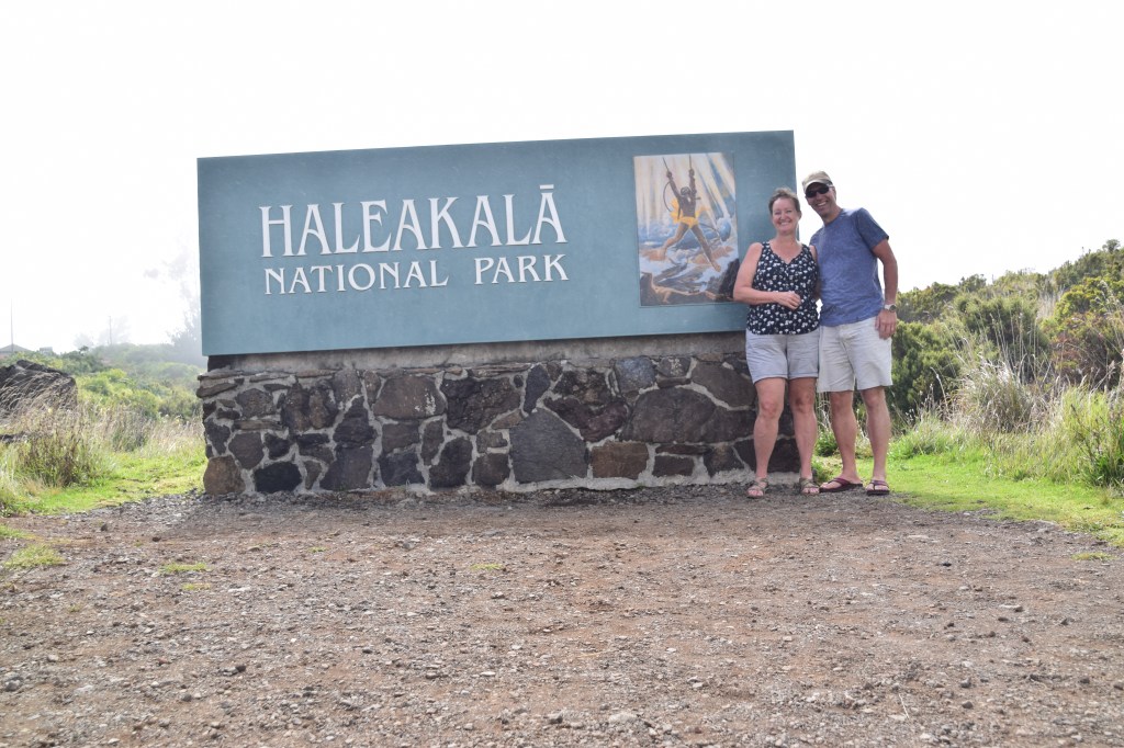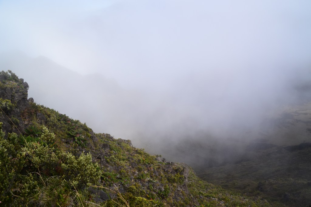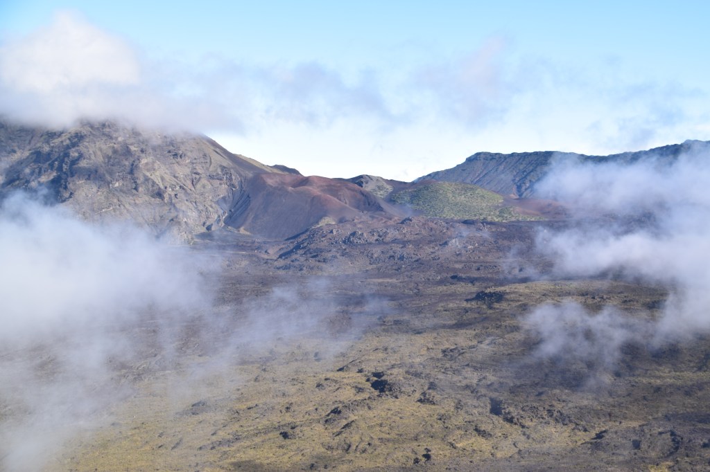 Our first stop on the climb was the Halemau’u Trail, which leads to a crater overlook. It was cloudy when we started, which means we were walking in the cloud. But the weather changes often and fast on Haleakela so we pressed ahead anyway. When we arrived at the crater edge there was a group there. A couple who live in Hawaii, his mother, and the mother’s friend (who happened to be from Wisconsin). They had been there a little while with no break in the clouds. We chatted a while and they eventually decided to leave. They got about 100 yards up the trail and the cloud blew out. Fortunately, they looked back, saw what was happening, and returned. It was a beautiful view and a great moment to share. We chatted some more, took photos of each other, then Chrissy and I went back up the trail and left them to enjoy the view alone.
