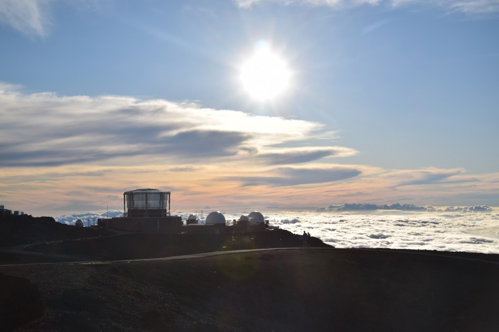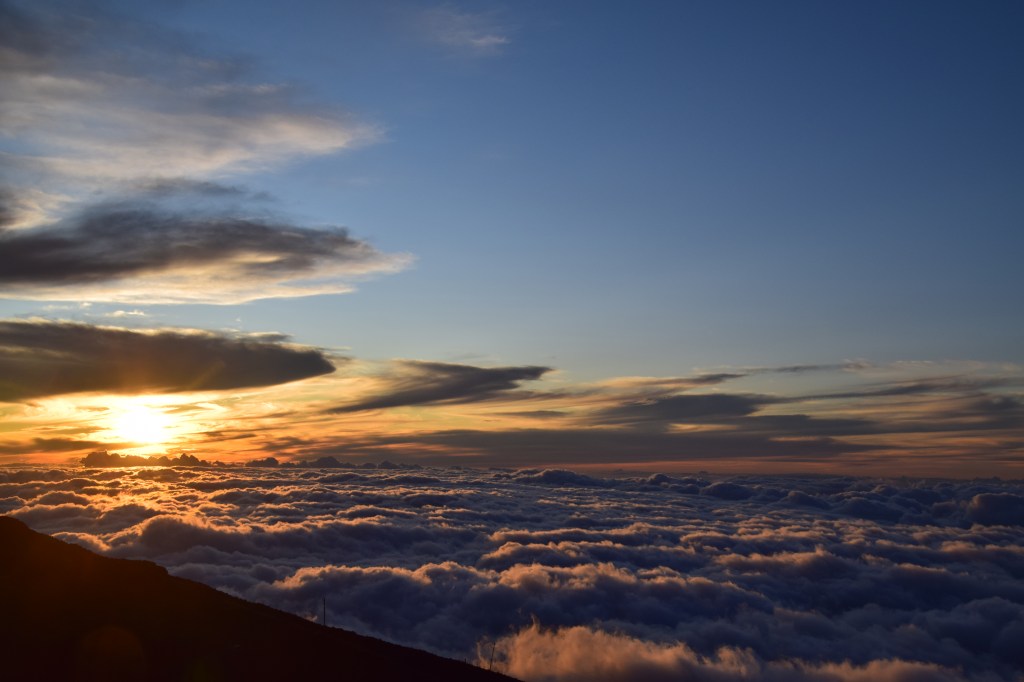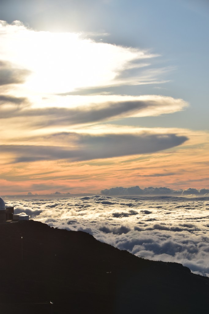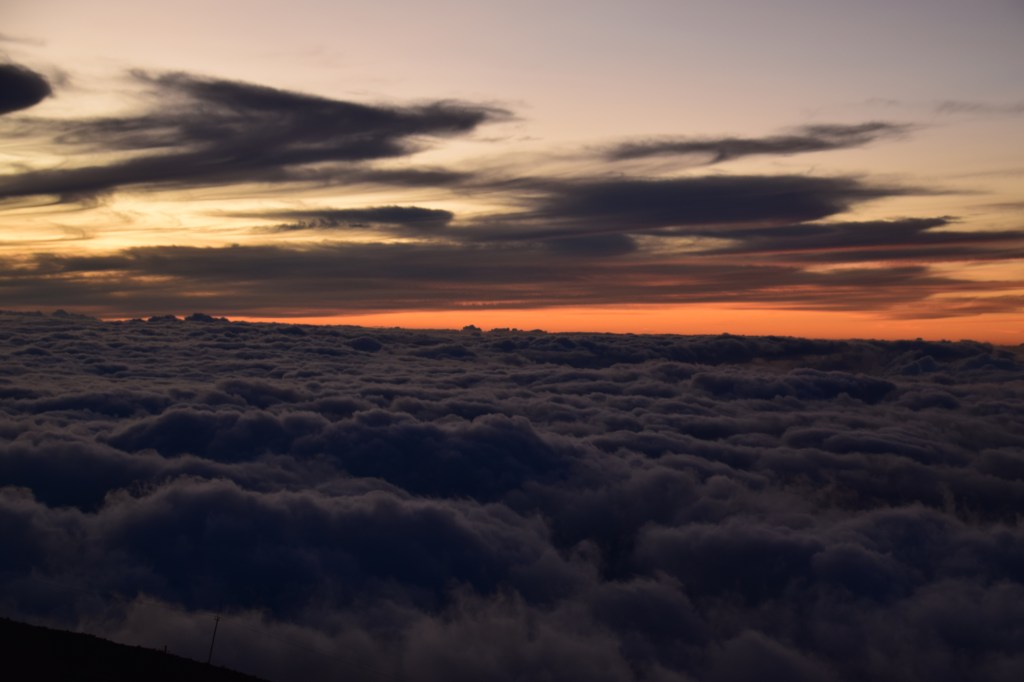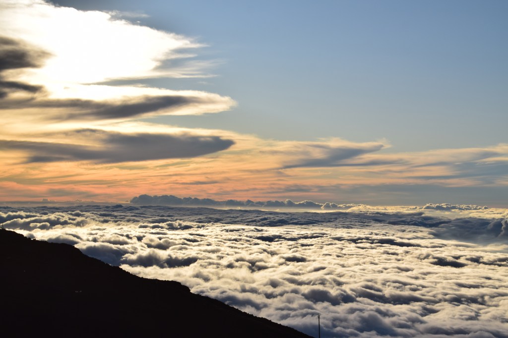 We continued on to the summit for sunset. I lived on the west coast of Florida for most of my life and have seen my fair share of beautiful sunsets over the Gulf of Mexico. But this was spectacular. There were clouds all around but we were above them. As the sun set through the clouds it looked like the sky was on fire. Then the colors – purple, orange, red, and green. An amazing sight, which almost made us forget how cold it was (50 degrees with a strong wind). Unlike our first trip, we were prepared, but it was still cold.