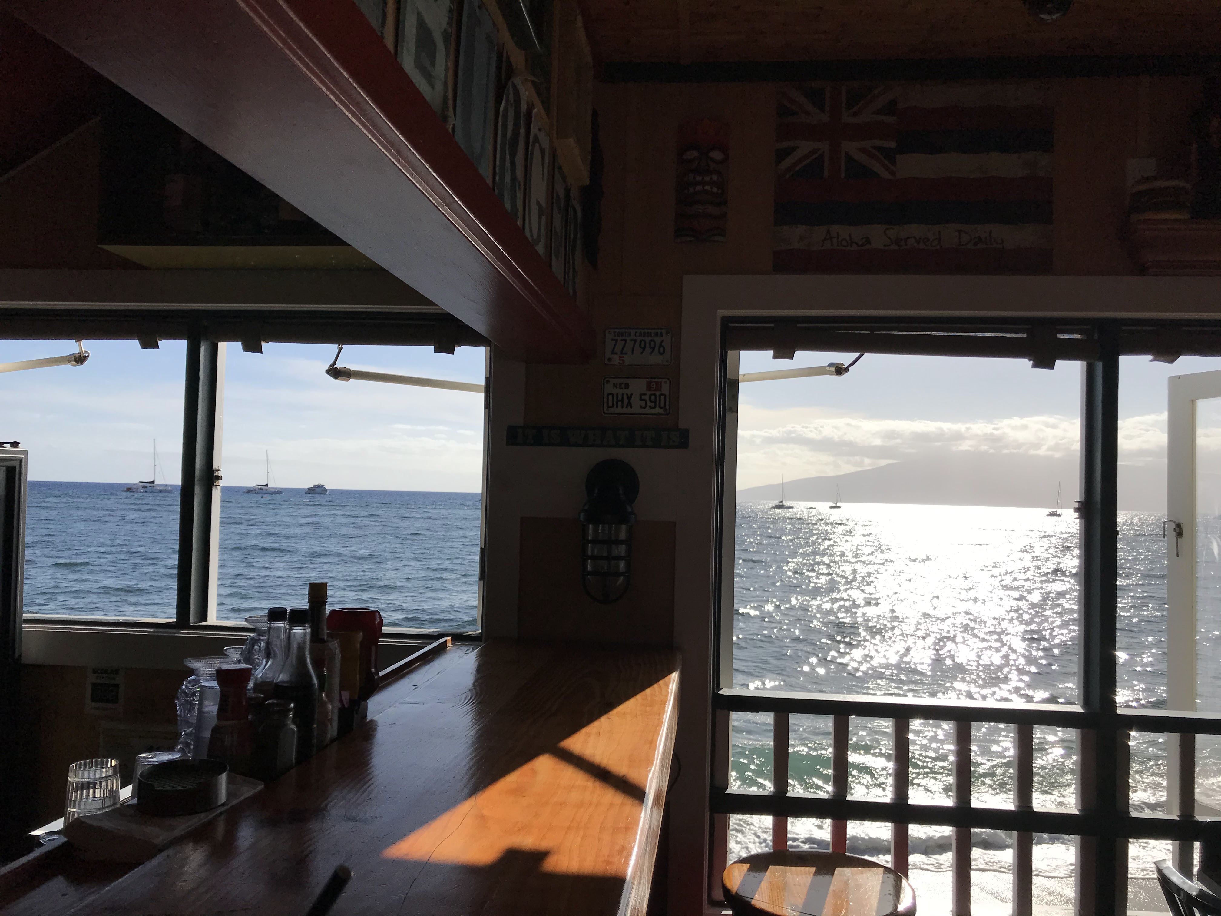 It was hard to believe Sunday was already our last full day in Maui. Time indeed flies when you’re having fun. It was another very lazy, relaxing day. In the morning we walked a few blocks up the street to the public beach. We found a shady spot under a tree and just sat for a while. In the afternoon we went to Lahaina and browsed around. I restocked my supply of aloha shirts and we went in several art galleries. We ended up at the bar at a restaurant called Cheeseburger in Paradise (http://www.cheeseburgernation.com/menu-for-lahaina/ ), overlooking the water and chatting with the bartender about her 17 year old daughter who was planning to go away to the University of Hawaii on Oahu in a year. With the pandemic upsetting everyone’s plans, I wonder if she made it.
