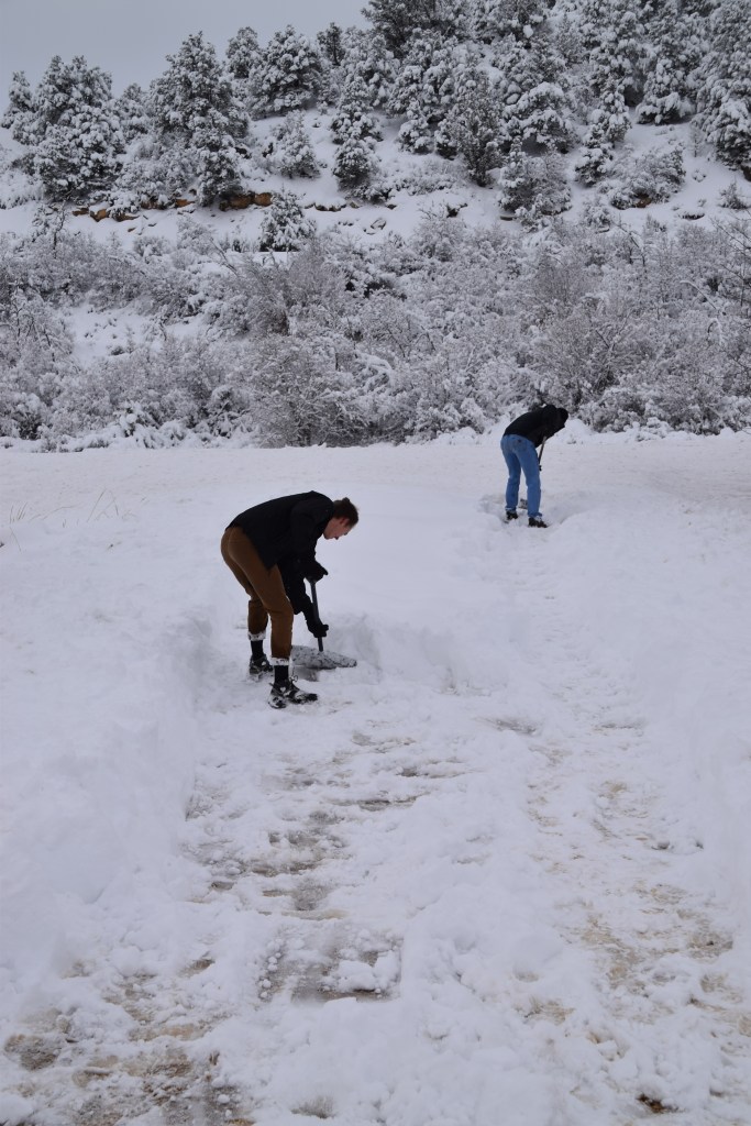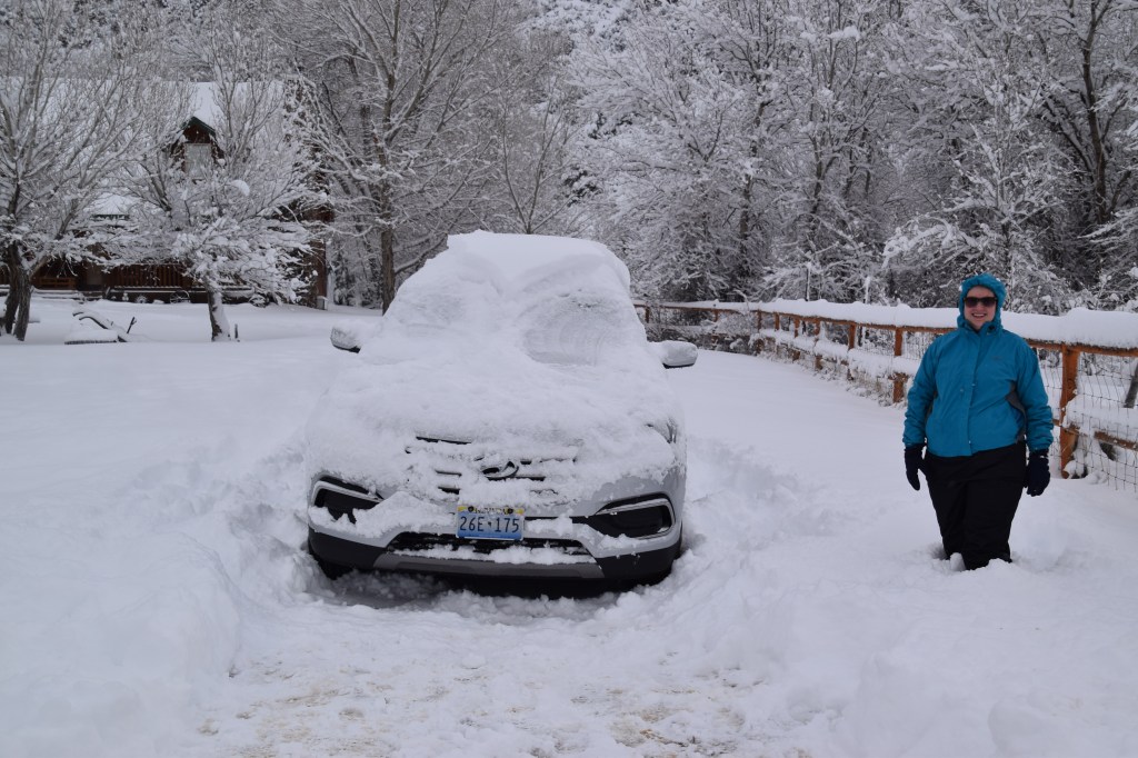 Despite it being Christmas, the plow and salt trucks were out and the highway in front of our cabin was clear. After staying in all day on Saturday we were ready to go take in some more beautiful Utah scenery. But first, we had to get the car out. The highway was clear, but the driveway had 14 inches of snow on it. I parked the car close to the end of the driveway, but Aaron and I ended up wishing I had parked it closer. Eventually we dug a path to the highway so we could get the car out and we hit the road to check out Bryce Canyon.