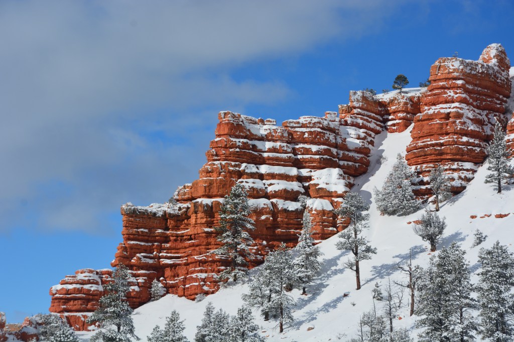 All the way to Bryce the views were incredible. Fresh white snow blanketed the mountains and as the day wore on clouds gave way to a stunning blue sky. We drove through Red Canyon along the way and were rewarded with beautiful views of the red canyon walls, evergreen trees sprinkled with delicate white snow, and all framed against the blue sky.