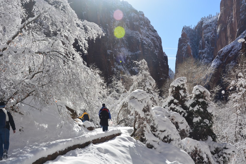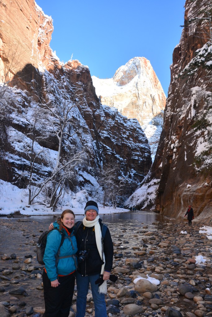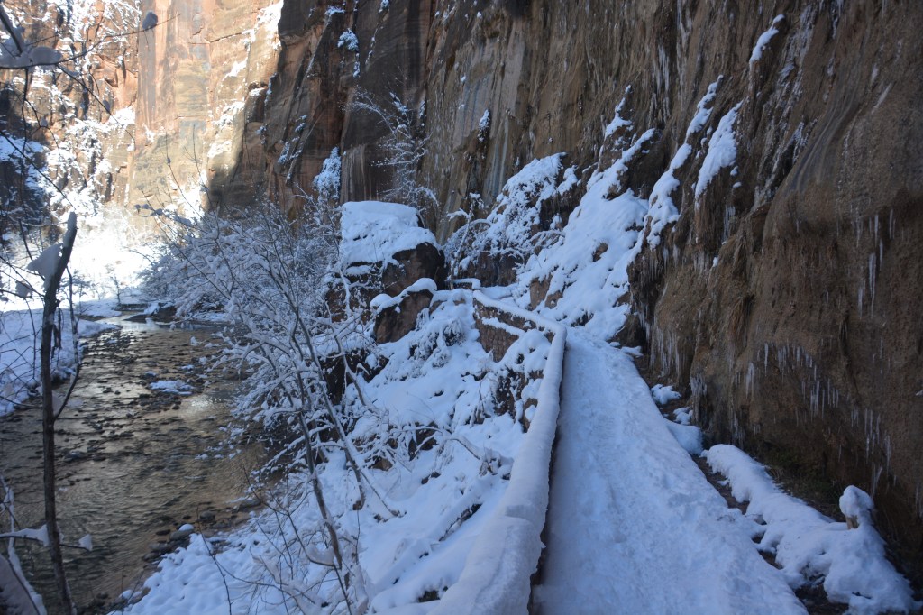 When we arrived in Zion a few days before, we went into Springdale and overpaid for some traction devices for our boots – something it was hard to find in Florida before we left. We carried them up to Angel’s Landing on Friday but didn’t need them. However, they found good use on Monday! The trail to the Narrows was covered with snow. The trees, the rocks, and even a fence along the trail had thick piles of snow – snow deep enough that it muffled all sound and we walked with only the sound of the running stream. As we walked we encountered a frozen waterfall, a few persistent leaves that were just not willing to drop even though autumn was well past, and slippery conditions that fully justified the traction device purchase. When we reached the end of the trail there were several people enjoying the view and several more equipped with wetsuits heading up the stream. We were a bit envious, but also glad we were warm and dry. We enjoyed the view from our vantage point and made a note to return someday to fully see the Narrows from the stream, in summer.